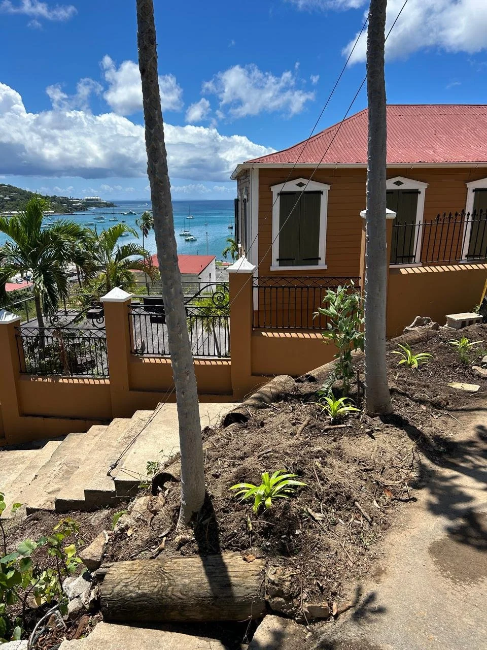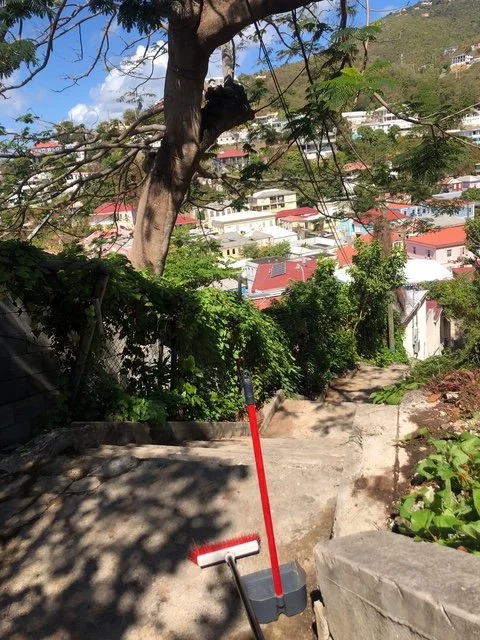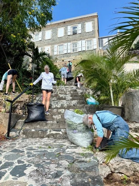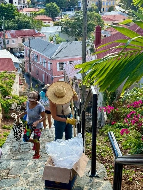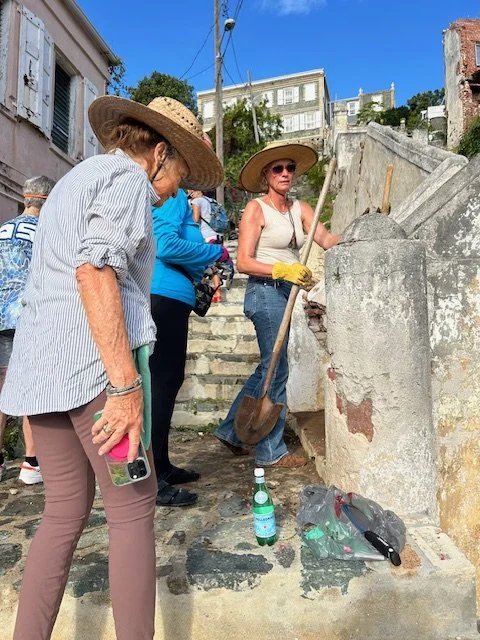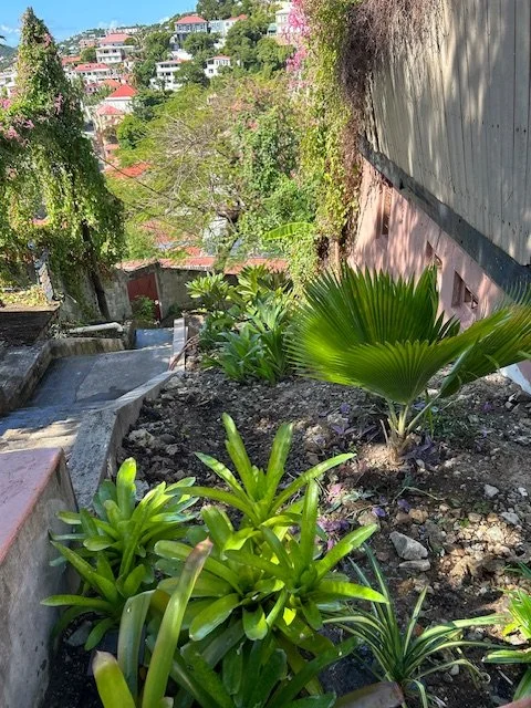 Danish for "Wide Street", Bred Gade is our most recent accomplishment in renovation of historic district step streets. This mid-town, stepped pathway is near Bakery Square and the St. Thomas Reformed Church. It links Nye Gade (New Street) with Murphy Gade up above. To note, two of the pedestrian walkways on the western face of Denmark Hill reach all the way up to the Catherineberg Road, thus connecting “low road” to “highroad” across Long Path. We are deeply grateful for the continued support from our community and abroad throughout this journey. This scope of work included the demolition of damaged sections, removal of debris, and the replacement of compromised concrete foundations. The restoration was completed with carefully selected stone and brick paving, thoughtfully installed to reflect and preserve the original historic character. From the generous partnership and grant from Solarfunden in Denmark and the State Historic Preservation Office, to the meaningful contributions of our dedicated St. Thomas community, we’re almost complete with our goals for Bred Gade. While the masonry work is now complete, there is still more to be done along Bred Gade. The restored step street now calls for essential additions like thoughtful landscaping and signage, which will ensure both historic preservation and natural beauty. With your continued support, we carry this momentum forward, revitalizing the historic district of Charlotte Amalie and restoring these steps as living, breathing spaces at the heart of our community once again. Currently, we are on the final phase with Bred Gade. The addition of a traditional bronze plaque to inform pedestrians of the history and contributors is our last final goal. Together, we have the opportunity to build something lasting and vibrant through maintenance like step street cleanups and plant ups that the St. Thomas Historical Trust hosts every month.